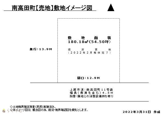| 形状 | 間口 12.9m × 奥行 14m | 道路 | 市道:南高田11号線 |