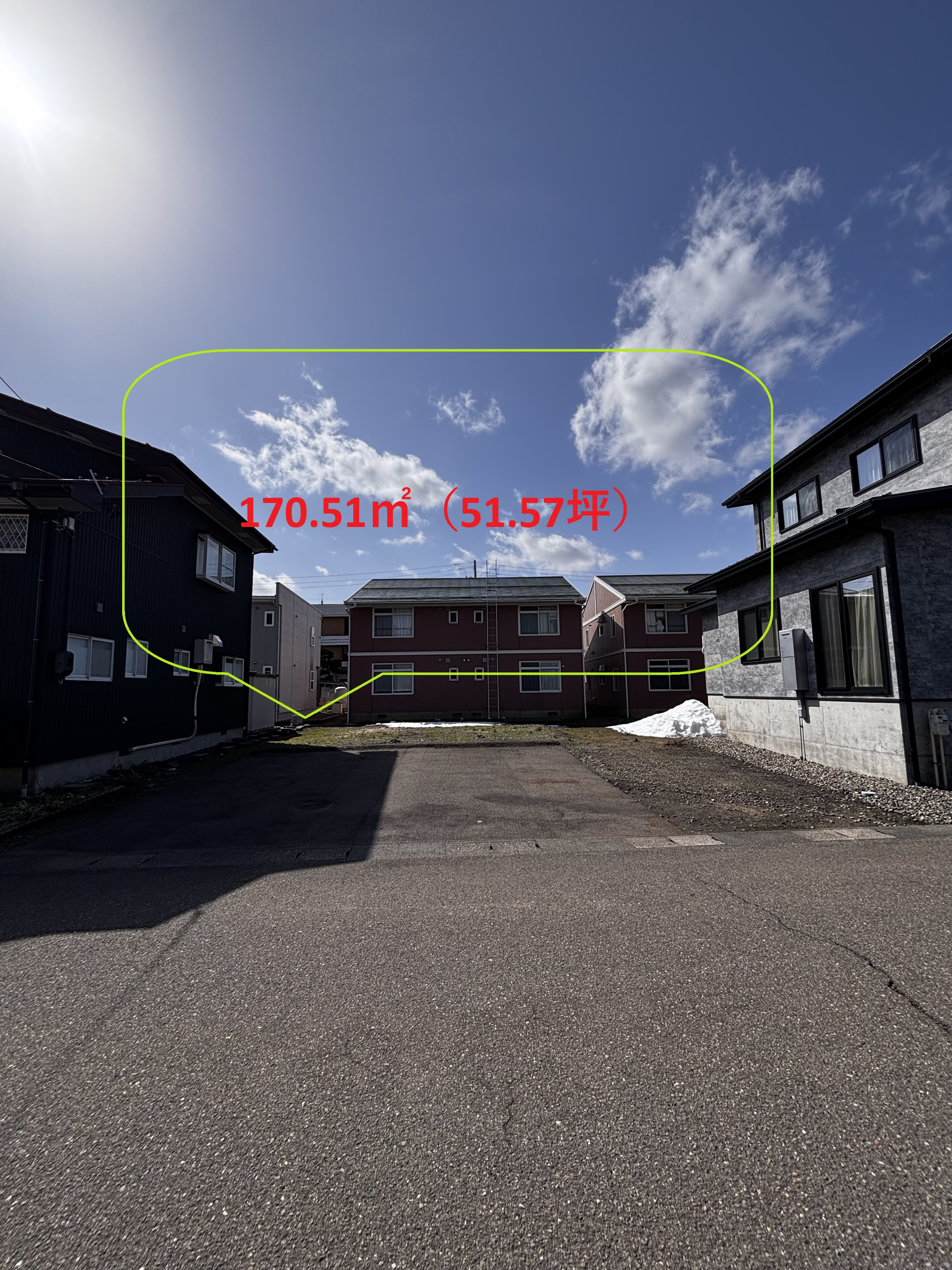 | 形状 | 間口 10.53m × 奥行 16.16m | 道路 | 北側/市道:幅員6.12m/除雪路線 |