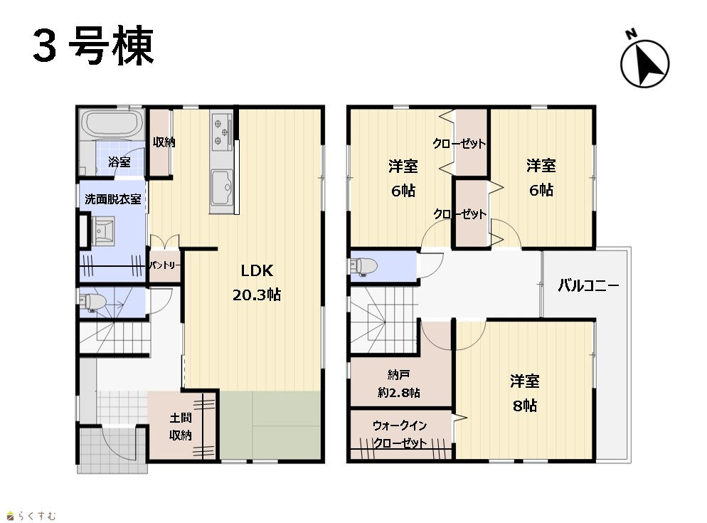 3LDK (洋室:8、6、6) LDK20.3 ウォークインクローゼット+納戸+土間収納あり |