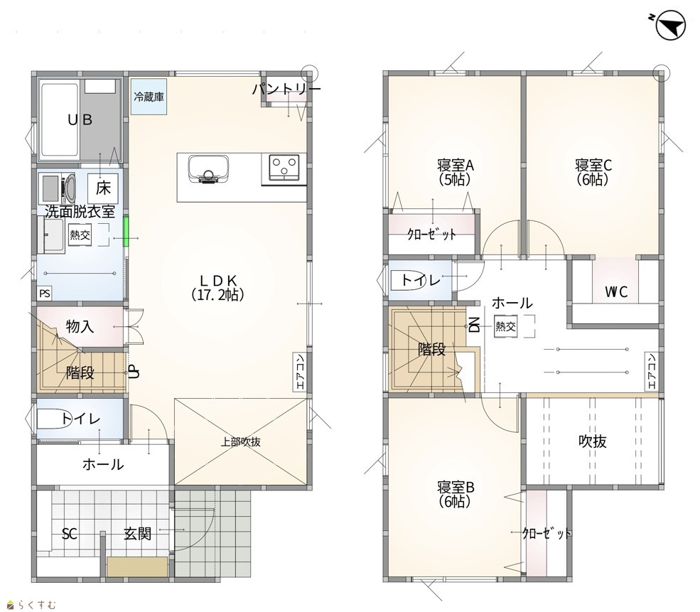 3LDK (洋室:6.0、6.0、5.0) LDK17.2 パントリー・リビング収納・シューズクロークあり |