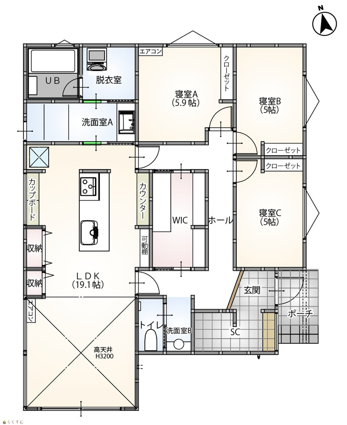 3LDK (洋室:5.9、5、5) LDK19.1 |