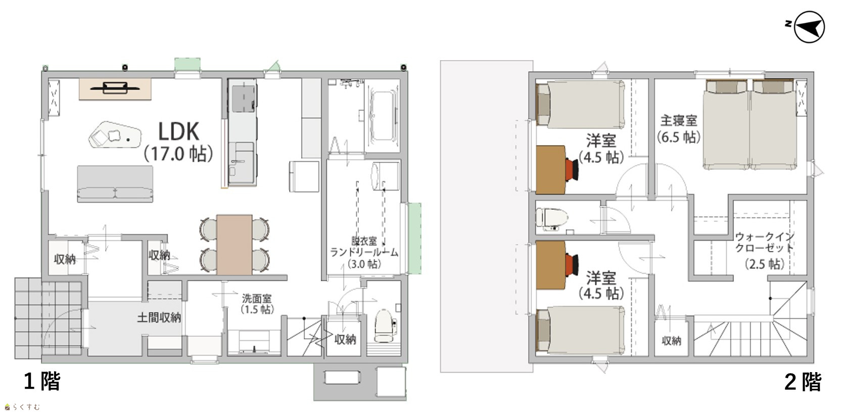 3LDK (洋室:6.5、4.5、4.5) LDK17 ウォークインクローゼット2.5帖、土間収納、脱衣室・ランドリールーム3帖あり |