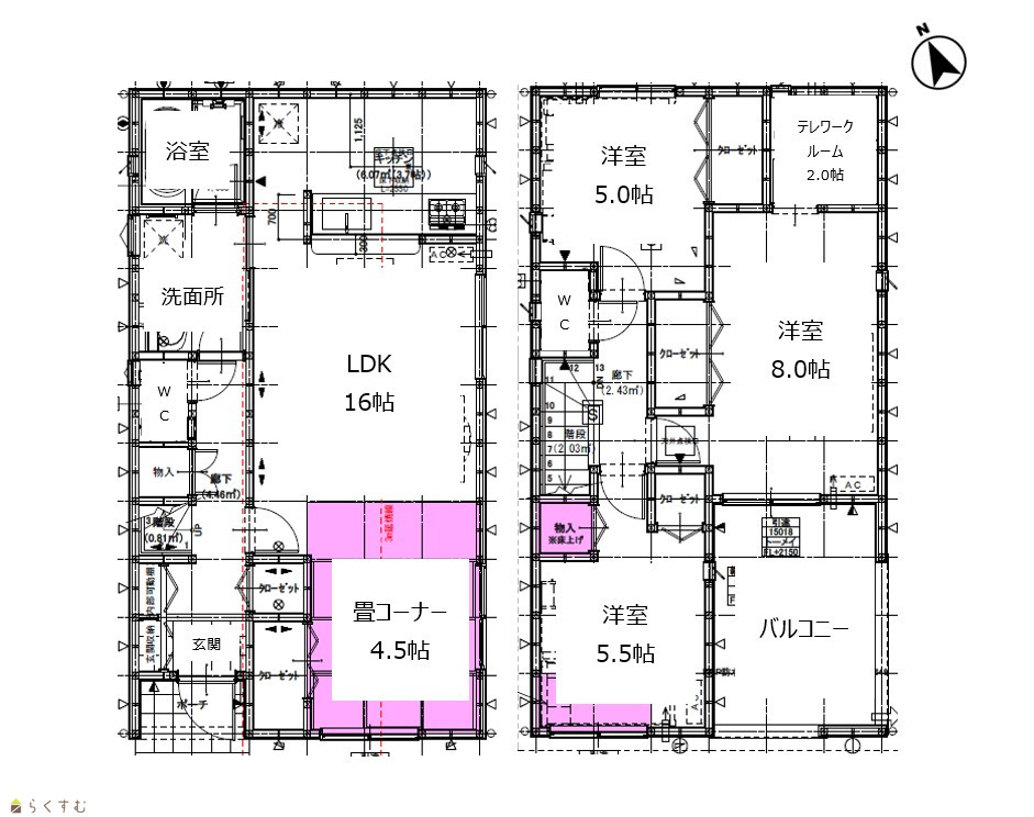 3LDK (洋室:8.0、5.5、5.0) LDK20.5 2階に2帖のテレワークルーム有 |