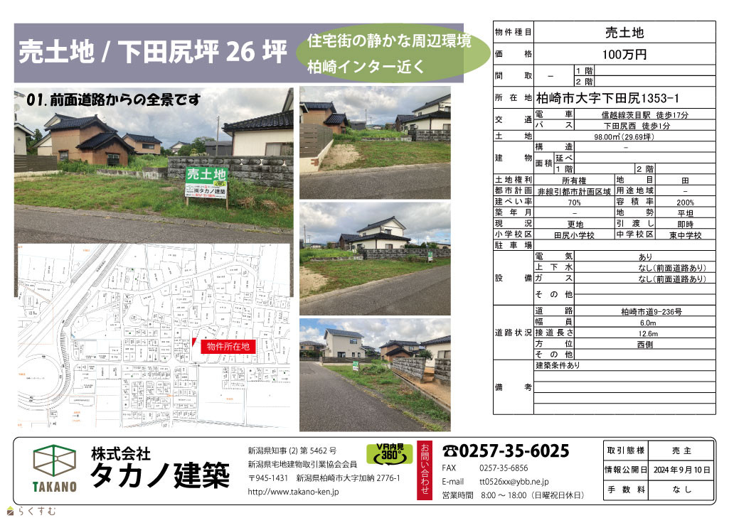 | 物件名 | 柏崎市 下田尻 売土地 | ||