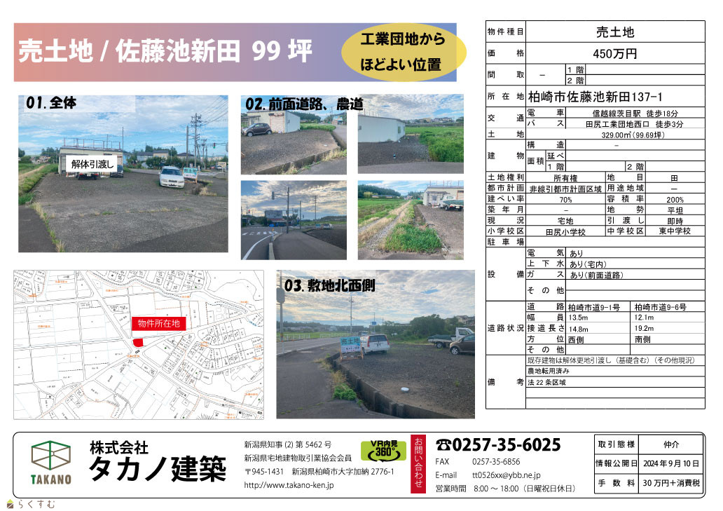 | 物件名 | 柏崎市 佐藤池新田 売土地 | ||