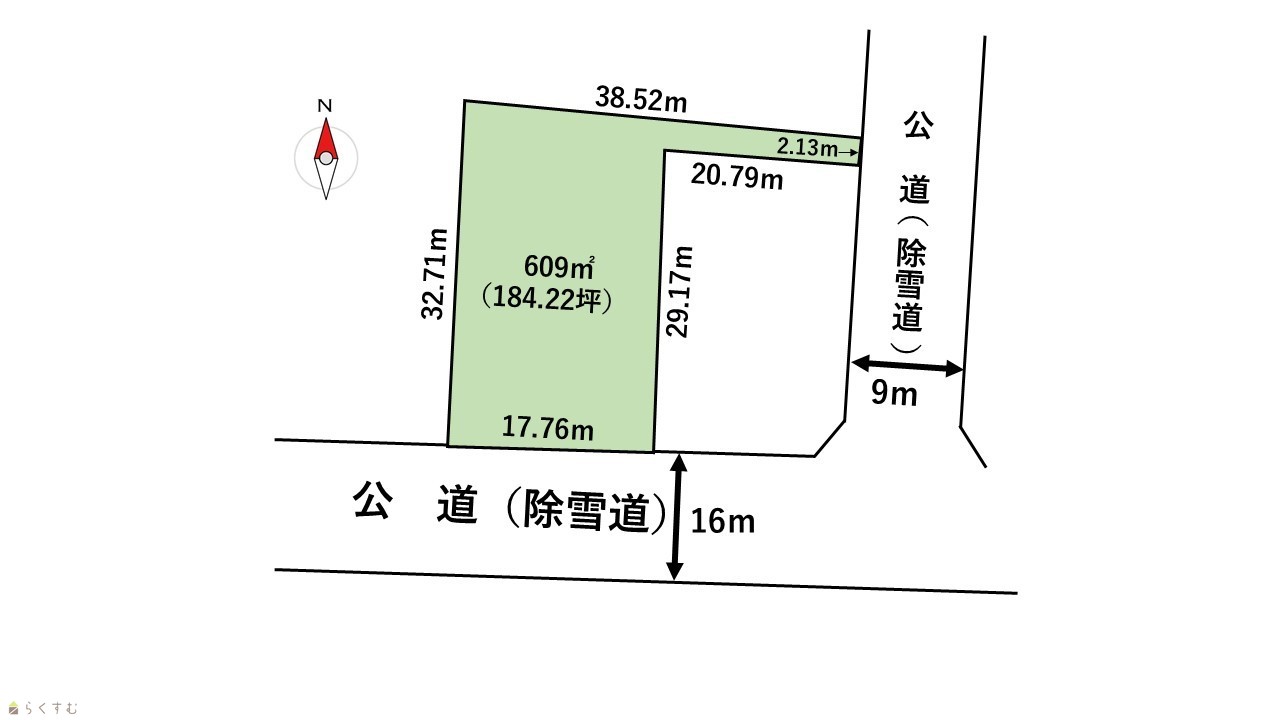 | 形状 | 間口 17m × 奥行 32m | 道路 | 南側:上越市道16m(除雪道) 東側:上越市道9m(除雪道) |
