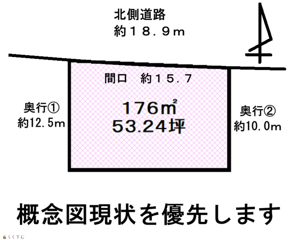 | 形状 | 間口 15.7m × 奥行 12.5m | 道路 | 北側約18.9m |