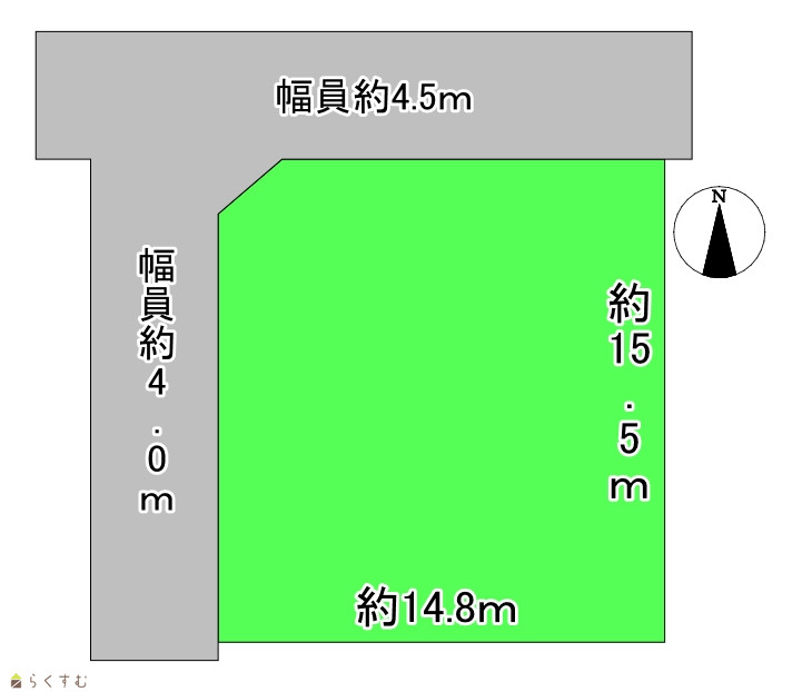 | 形状 | 間口 14.8m × 奥行 15.5m | 道路 | 市道 北側幅員約4.5m 西側幅員約4.0m 除雪道 |