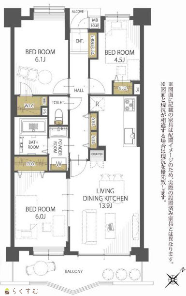 間取り 3LDK (洋室:6.1、6.0、4.5)