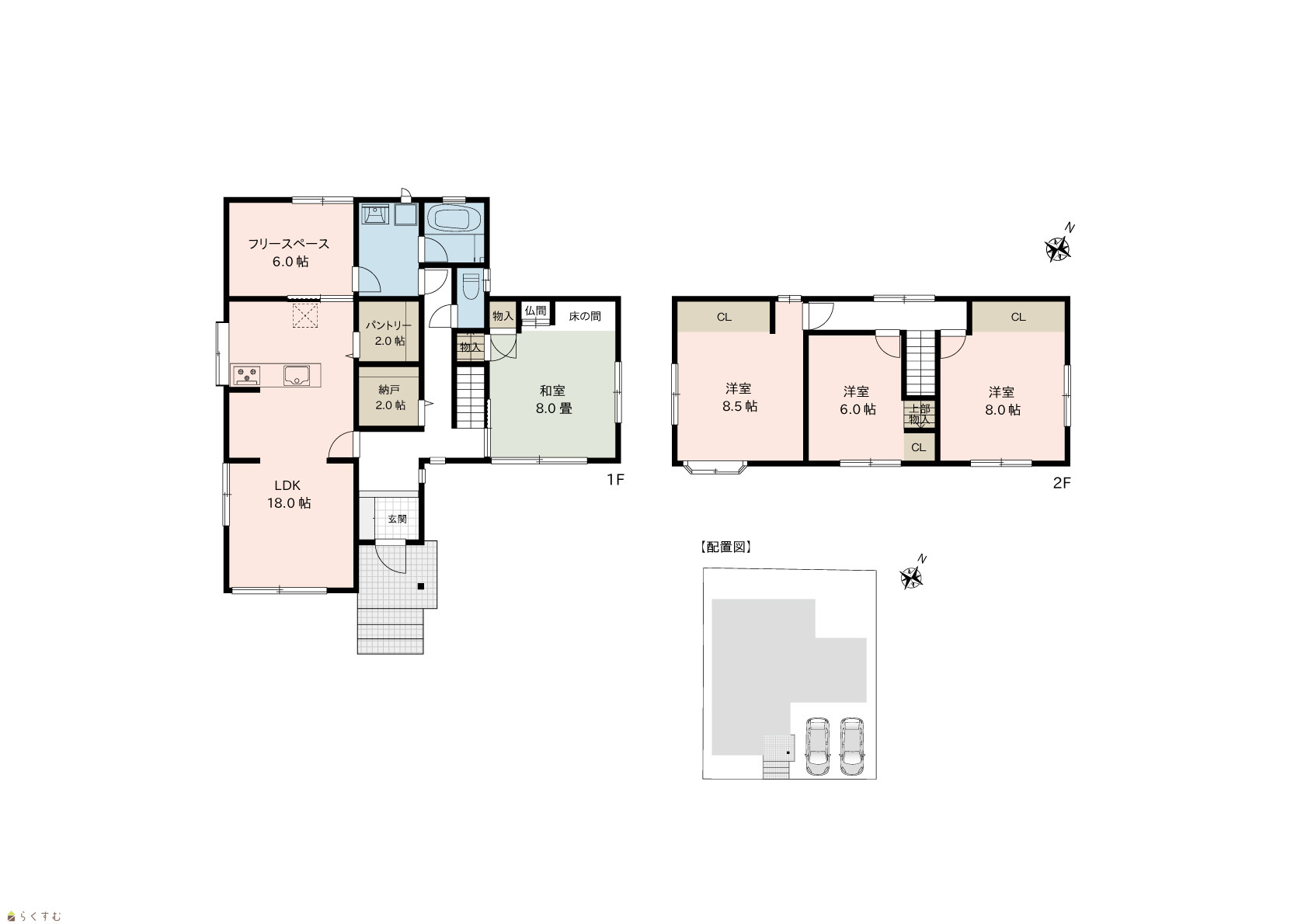 4LDK (和室:8.0畳) (洋室:8.5、8.0、6.0) LDK18.0 |
