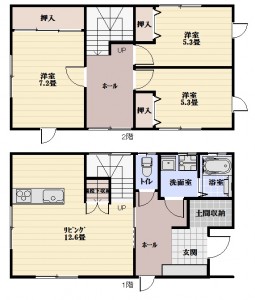 3LDK (洋室:7.2、5.3、5.3)、LDK12.6