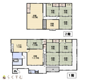 11LDK (和室:8畳、8畳、8畳、7.5畳、6畳、6畳、6畳、6畳) (洋室:18.5、12.5、6)、LDK10