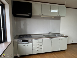 システムキッチンの3つ口コンロ付き。モニター付きインターホンあり。エアコン全室あります。