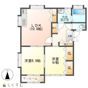 2LDK (洋室:6.6、6.3)、LDK10.8