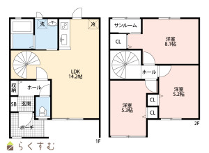 3LDK (洋室:8.1、5.3、5.2)、LDK14.2、※洋8.1帖にサンルーム部分も含まれます。
