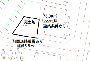 • 設備 角地、南側道路面す、学校近く、閑静な住宅街、建築条件なし、所有権、都市ガス(前面道路)、上水道(前面道路)、下水道(前面道路)、前面道路融雪設備あり