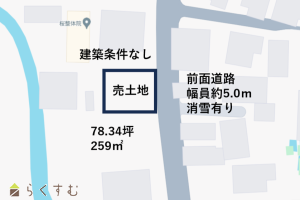 角地、学校近く、スーパー近く、最寄り駅近く、建築条件なし、所有権、都市ガス(前面道路)、上水道(前面道路)、下水道(前面道路)、上水道(宅地内)、前面道路融雪設備あり、住宅向け