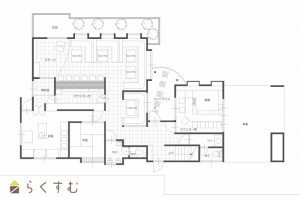 1階:厨房エリア(厨房機器設備なし)・カウンター席・客席・ステージ・和室4.5帖1室・トイレ2ヵ所・1階洋室8帖1室/2階和室10帖2室