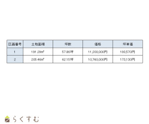 ■坪単価 【区画1】193,570円~【区画2】173,130万円