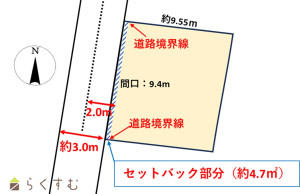・西側前面道路は「2項道路」に該当するため、約4.7㎡のセットバックが必要です。