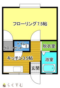 1DK (洋室:7.5)、キッチンに冷蔵庫置けます。