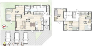 4LDK (洋室:9.5、8.6、6.5、6.0)、LDK22.3