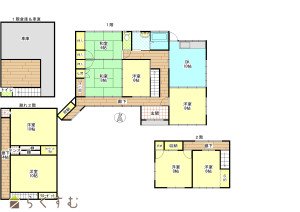敷地内は、母屋を賃貸、2階建の作業小屋、廊下で繋がっている別棟2階建ての倉庫、果樹園と配置されています。