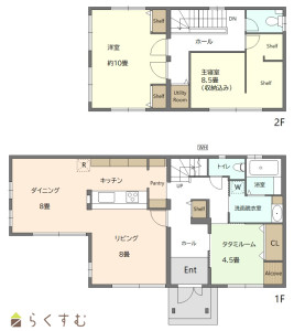 3LDK (和室:4.5畳) (洋室:10、8.5)、LDK22、LDK面積にはパントリー含む。主寝室には収納含む