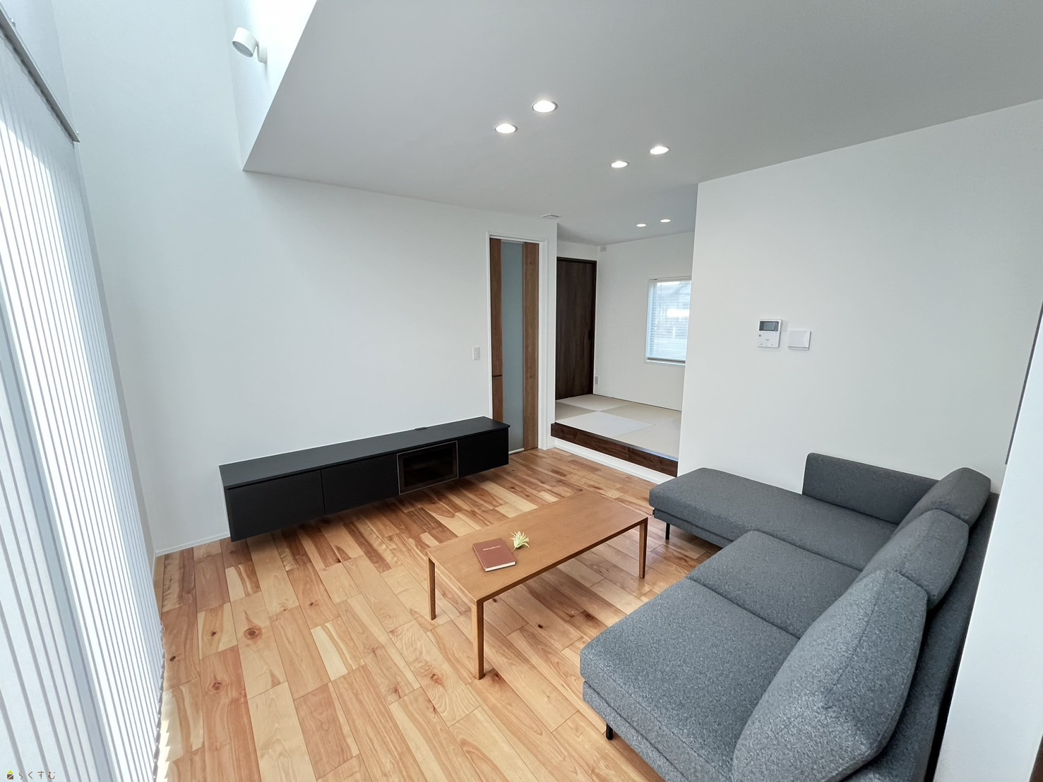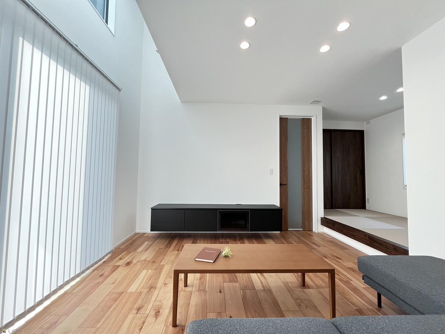 吹き抜けから陽の光が差し込む明るい19.75帖のリビング。